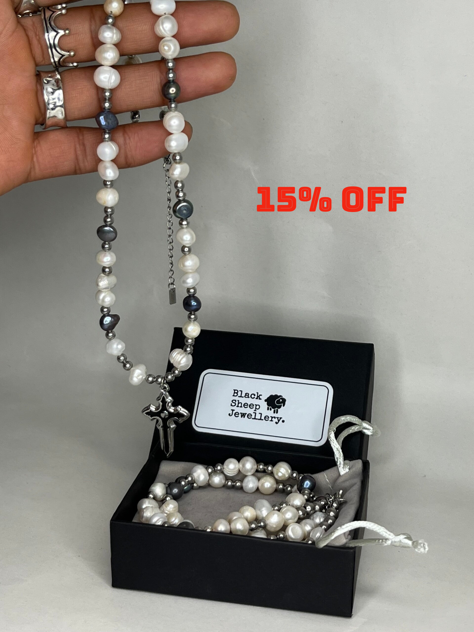 Handcrafted Necklace Set featuring exquisite freshwater Pearls, thoughtfully design to achieve an elegant finish. This set showcase stunning black freshwater pearls paired with a sleek stainless Cross, creating a luxurious and sophisticated appearance.